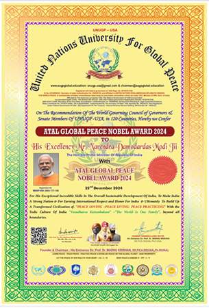 Hon’ble Prime Minister Of India Shri Narendra Modi Jii is Honoured with ” ATAL GLOBAL PEACE NOBEL AWARD 2024″ from His Eminence Prof. Dr. Madhu Krishan , The Eminent Scientist , Chairman cum Chief Rector of The UNITED NATIONS UNIVERSITY FOR GLOBAL PEACE USA , as a tribute to Hon’ble late Atal Bihari Vajpayee ji on his Birthday Jayanthi in a befitting event at Jammu , India .
